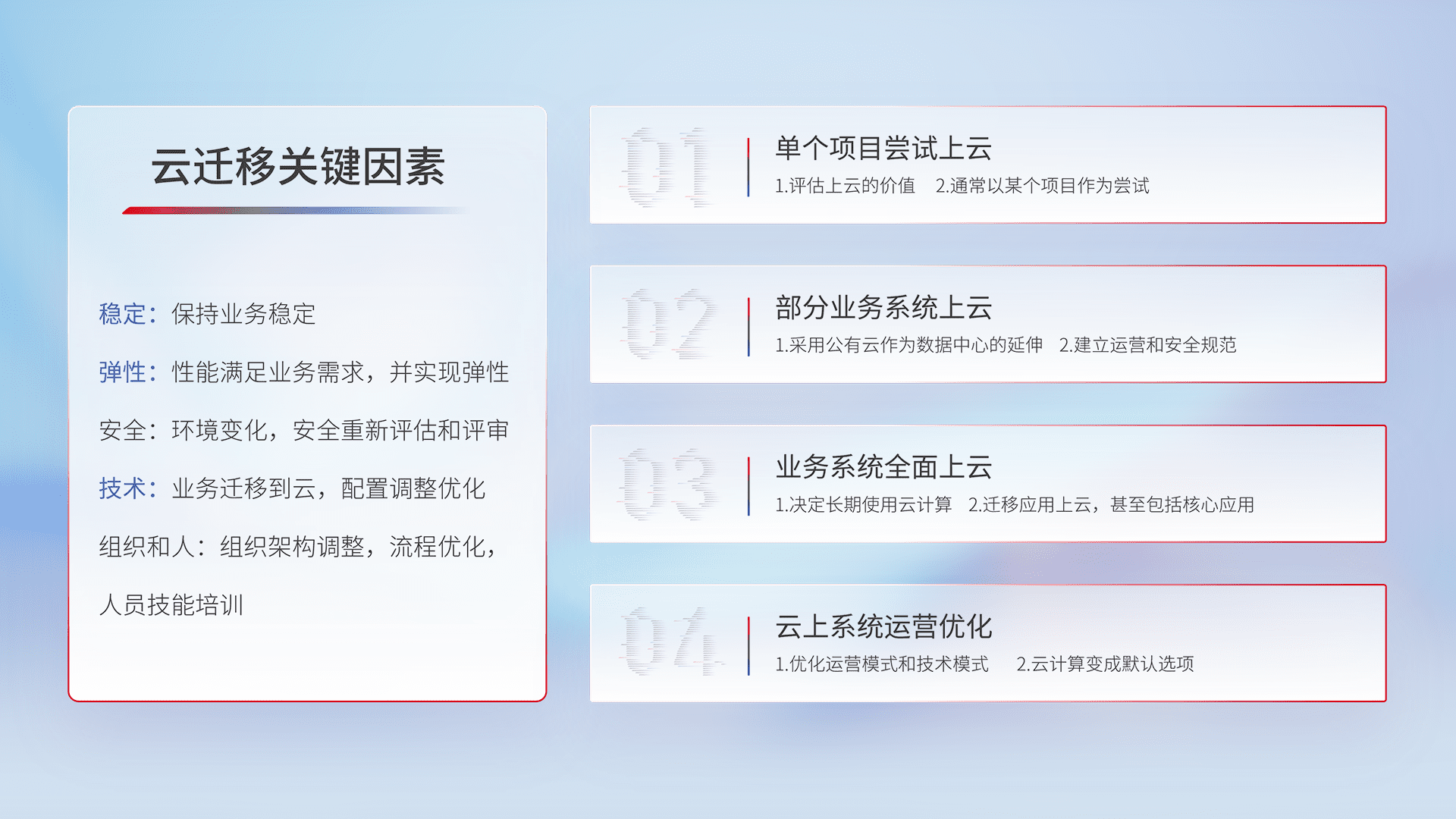 结合实际业务,,,从规划设计、、、云平台选型、、云原生改造、、、数据迁移、、集成交付,,,迁移全过程为客户识别最佳上云路径,,,,做好风险识别管理,,,,设计网络架构、、身份权限、、、、安全审计合规、、、操作审计、、日志审计、、监控告警策略、、、多站点容灾设计等,,,对云上基础设施进行整体规划,,,提升IT治理水平,,,以满足弹性、、、高可用、、、、高性能的需求。。