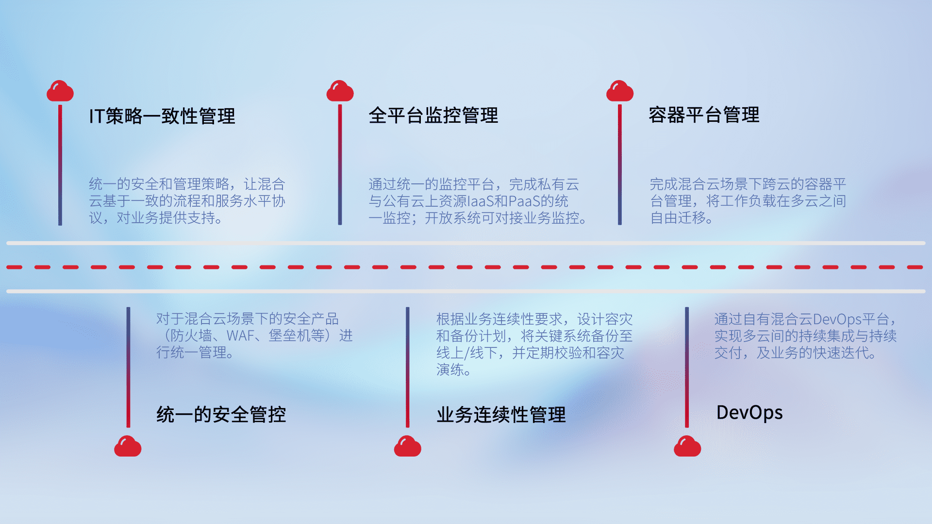通过多云纳管,,,以统一的资源数据模型把客户的云资源进行抽象和封装,,进而实现对多云资源的统一操作,,保障云资源管理的可靠性、、、稳定性与可用性。。量身定制化运维内容,,配置、、开发运维、、、、补丁管理、、备份、、、监控、、、、认证和访问管理、、审计和日常巡检等,,,,保障在用云过程中的可靠度,,,,稳定度以及高可用率。。。